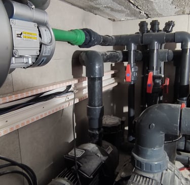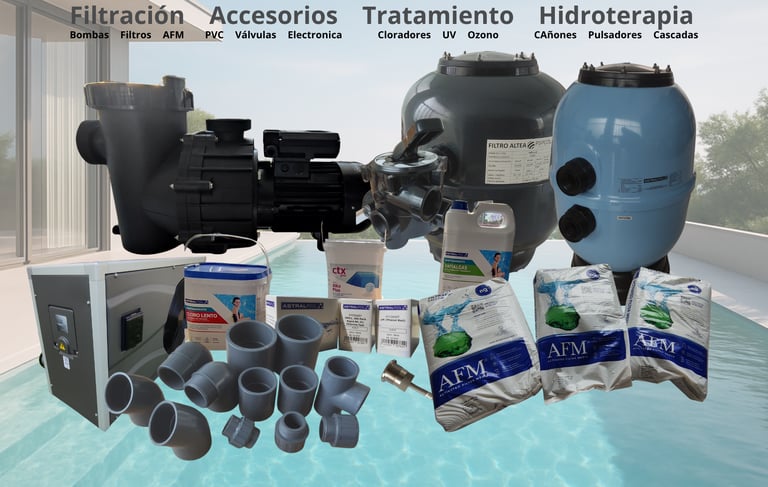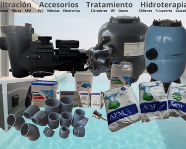 Equipos para el tratamiento y desinfección del agua, filtración, bombeo, recambios, suministro de accesorios de PVC y PP, piscinas prefabricadas y salas técnicas a medida